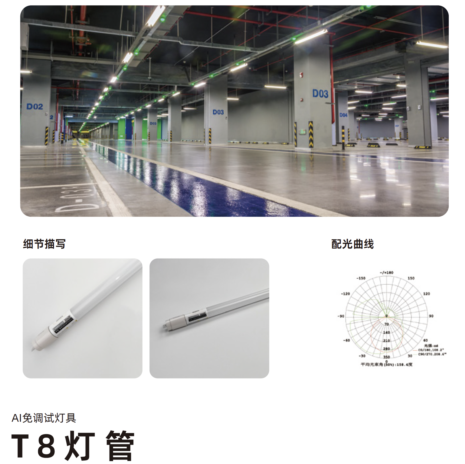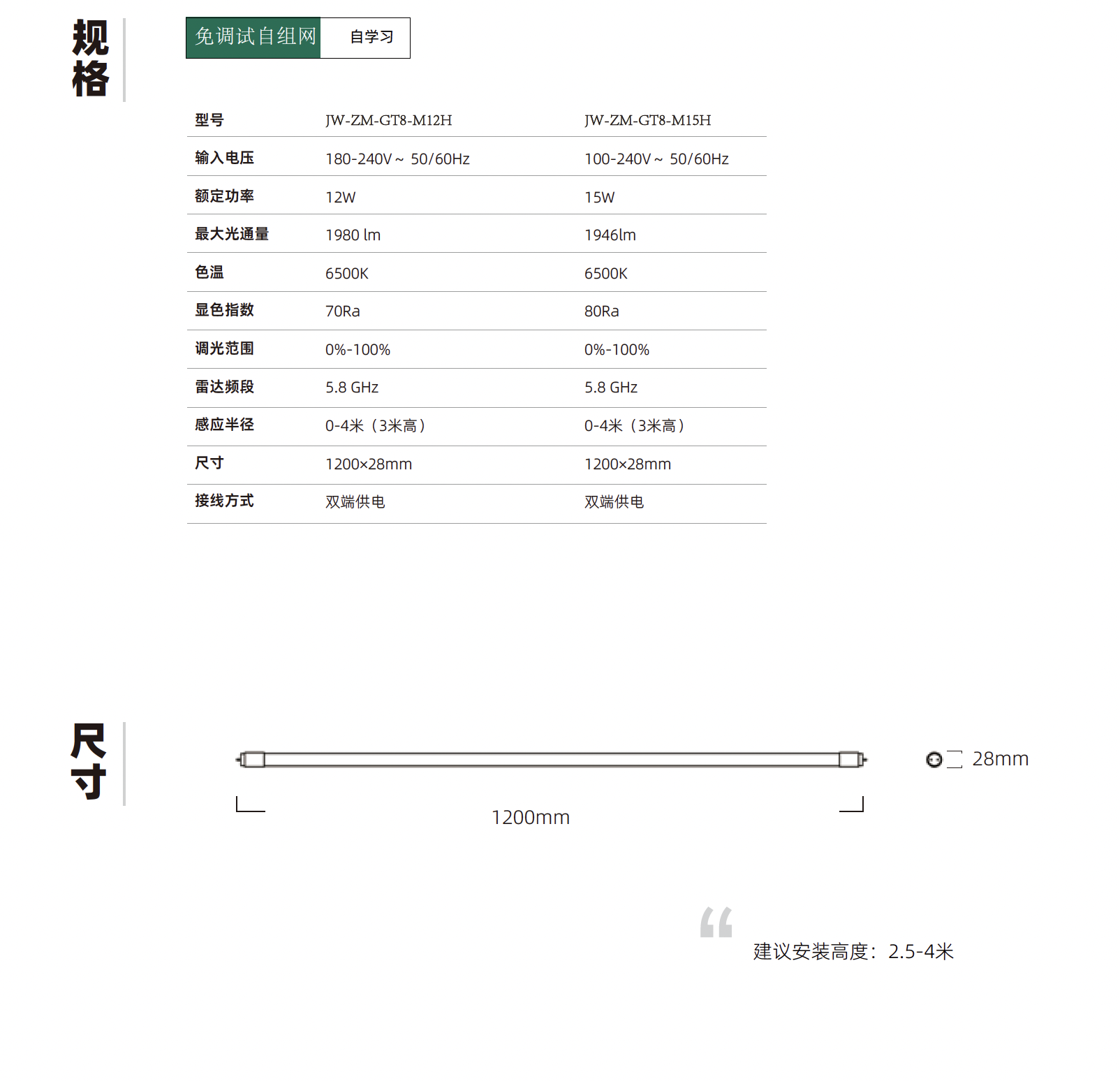 采用智能组网模块一体化设计,除具备普通T8雷达感应灯管的功能外,灯具之间通过JW2.4G无线协议自动组网,内置集群智能AI算法,无需调试即可使用。